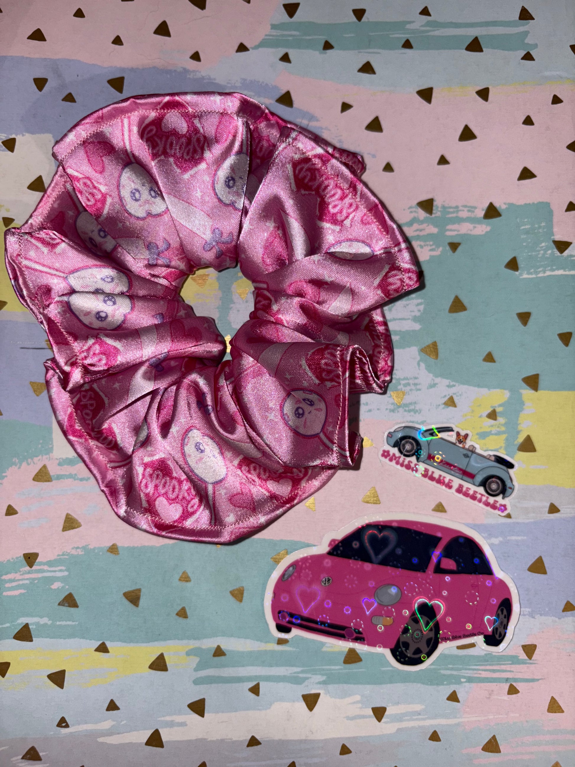 Fabric Art by “Your Spooky Girl” and sew by us! Satin scrunchie! fabric printed in the USA by a woman owned small business! * sticker not included but available for sale !