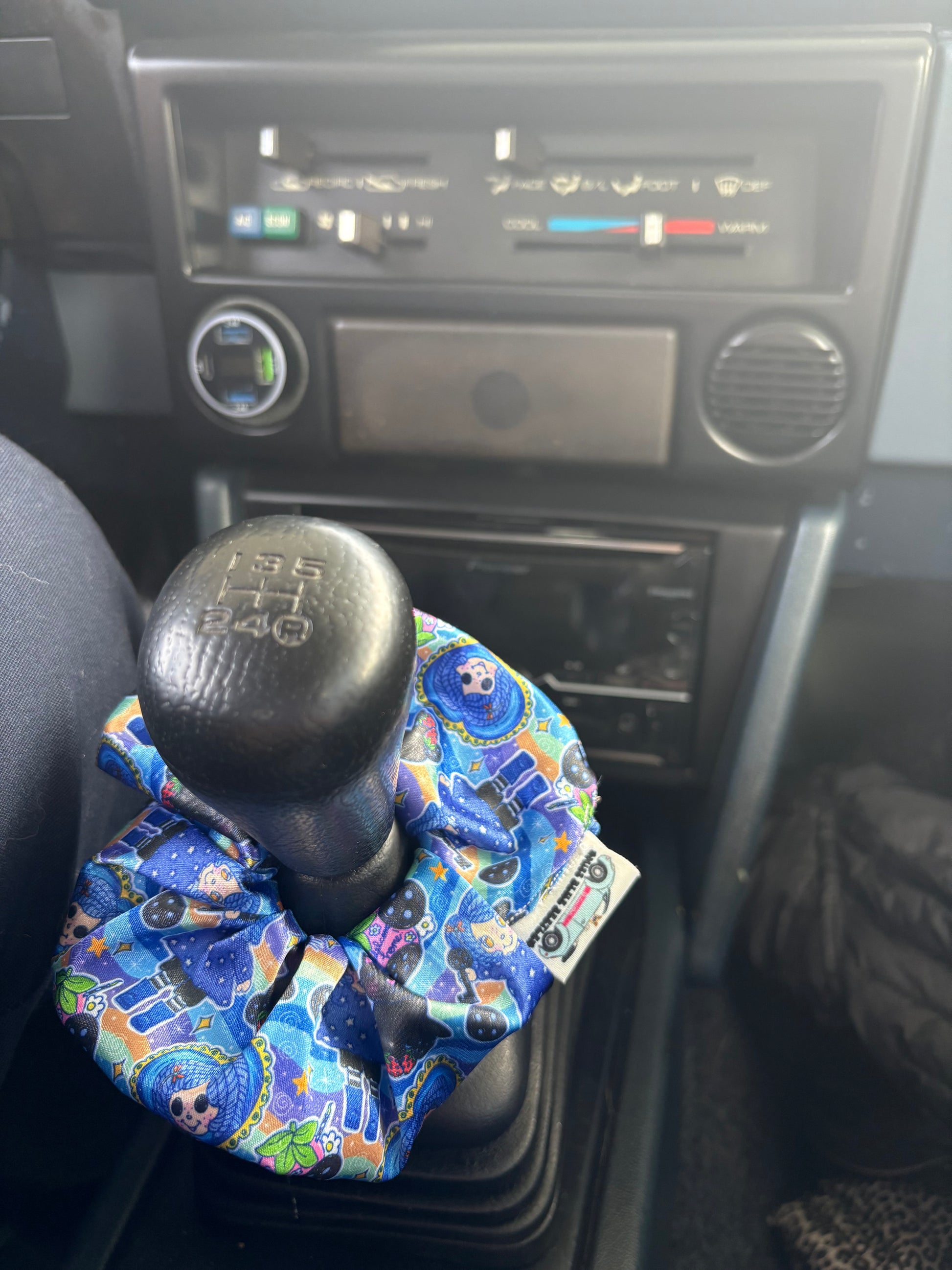 Blue hair button eyes and cute black cat! sew by us! Soft silky Satin scrunchie! fabric printed in the USA by a woman owned small business!